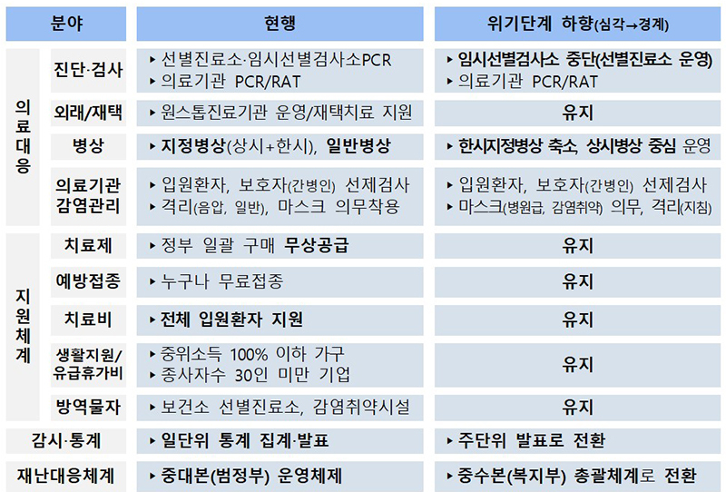 특히 입원치료비, 치료제, 예방접종, 생활지원비와 유급휴가비인 격리지원금 등의 지원도 당초 계획대로 당분간 유지해 국민의 부담을 최소화합니다. 이 외에 매일 발표하는 확진자 통계는 주단위로 전환하고, 위기단계 하향에 따라 범정부 대응인 중앙재난안전대책본부에서 중앙사고수습본부 중심의 재난위기 총괄 체계로 전환됩니다.