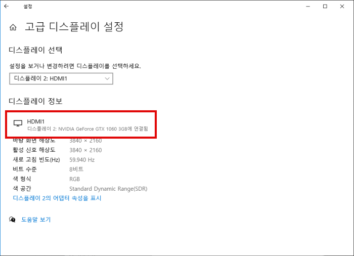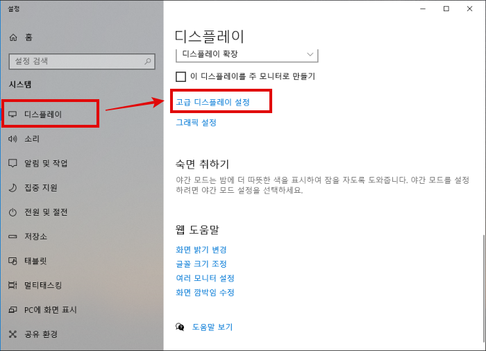 Windows 10에서 디스플레이 설정으로 컴퓨터 그래픽카드 확인하는 방법입니다.