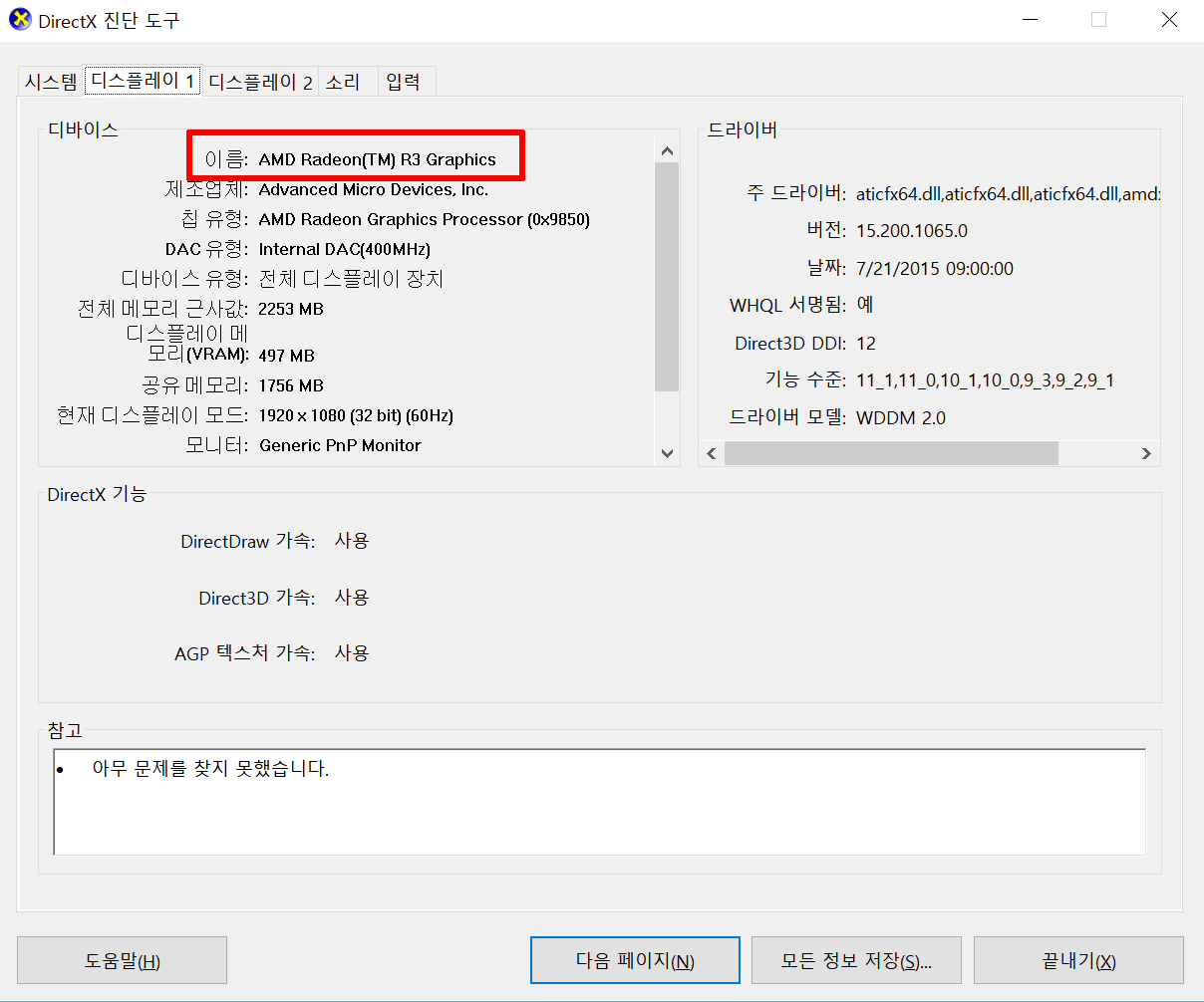 디스플레이를 눌러주시면 디바이스 아래에 이름 : AMD Radeon(TM) R3 Graphics라고 있습니다