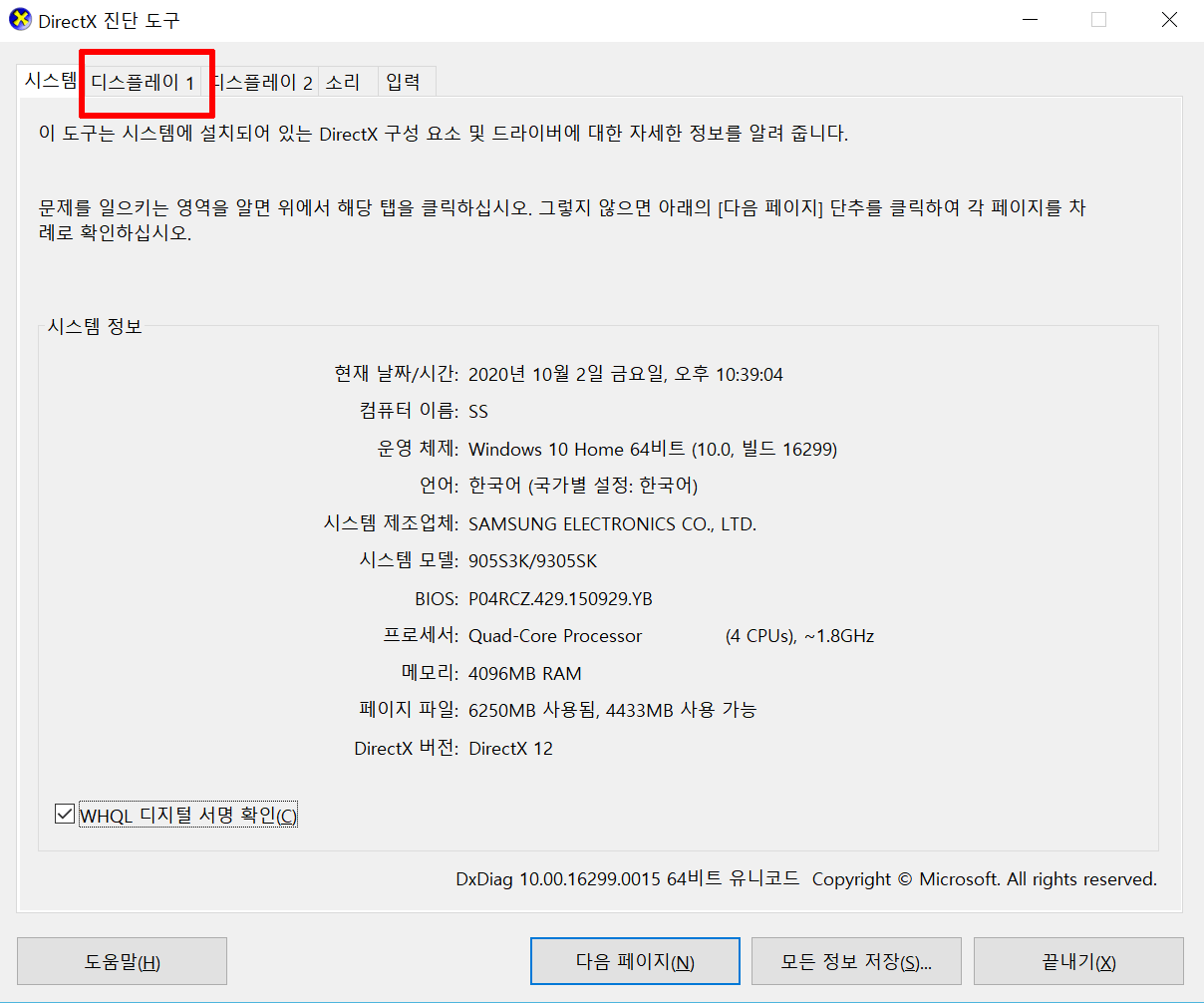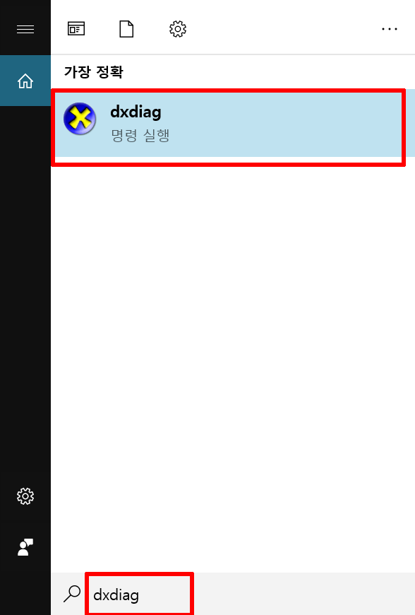 돋보기툴을 클릭하기고 하단 검색칸에 dxdiag 라고 입력을 합니다. 그러면 위에 dxdiag라는 명령 실행이 나옵니다. 이걸 클릭하시면 됩니다. 이것만 하시면 거의 다 된겁니다.