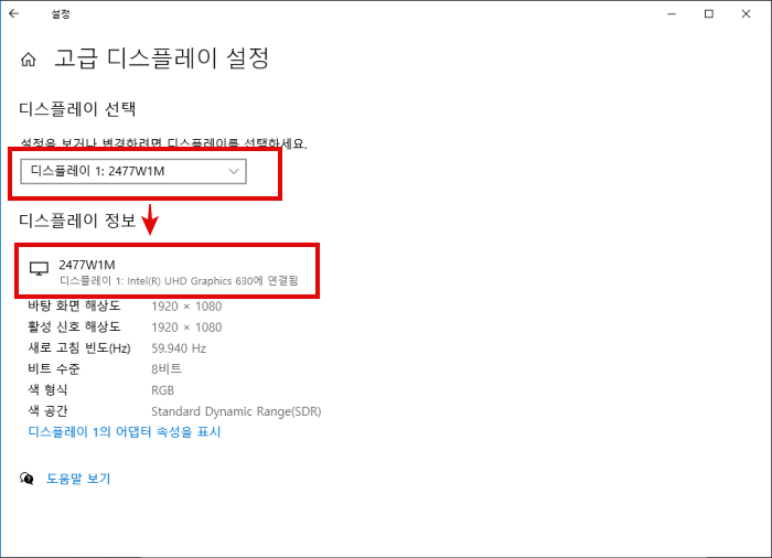 듀얼모니터를 사용하신다면 모니터별로 어떤 그래픽카드에 연결되었는지 확인이 가능합니다. 위에서 보시면 32인치 모니터에는 NVIDIA GeForce GTX에 연결되었고, 24인치 모니터에는 메인보드 기본 그래픽카드 Intel(R) UHD Graphics 630에 연결된것을 확인하였습니다.