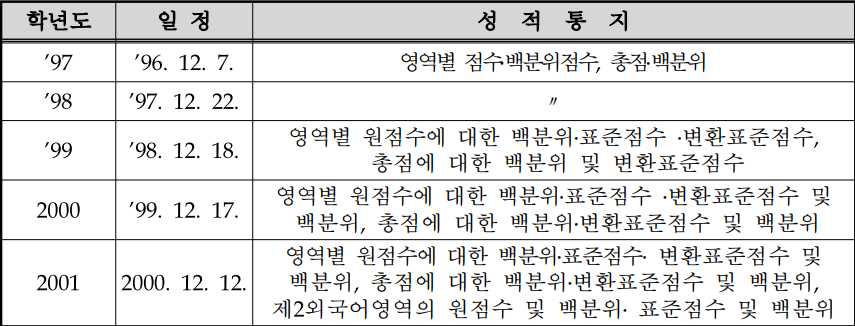 97년부터 400점 만점으로 변경되어 2001년까지 운영 되었습니다. 이때도 매년 약간의 변화는 있었지만 성적표에는 총점과 영역별 점수, 백분위 등이 표시되었습니다.