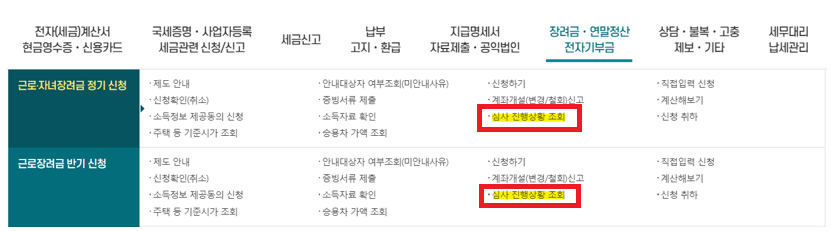 → 홈택스 홈페이지 접속 → 로그인 → 장려금ㆍ연말정산ㆍ전자기부금 → 근로장려금 정기 신청 또는 반기 신청의 심사 진행상황 조회 선택