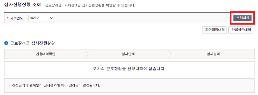 → 귀속연도 설정 후 우측의 조회하기 버튼을 선택하시면 아래의 화면으로 근로장려금 심사진행상황 결과에 대해 확인할 수 있습니다