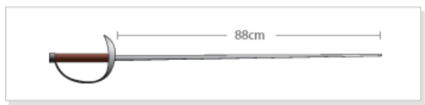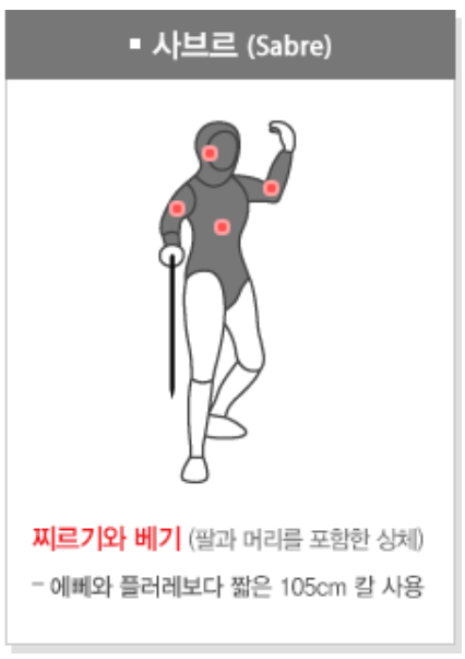 사브르는 찌르기와 베기가 가능합니다. 다른 종목에 비하여 날 길이가 88cm로 짧고 무게 또한 500g 이하의 검으로 앞날 전제와 뒷날의 1/3 부분으로 팔을 포함한 상반신을 찌르거나 베면 득점이 인정됩니다.