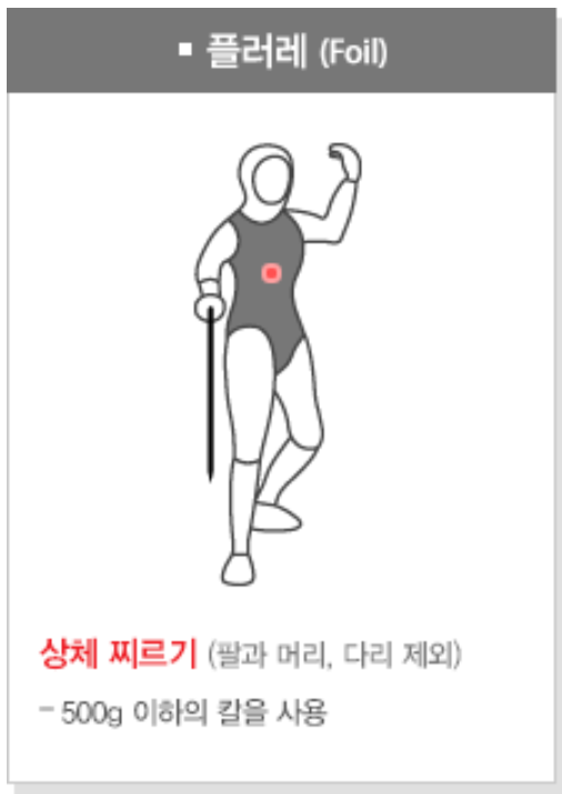 플뢰레 종목은 상체 찌르기만 가능합니다. 또한 칼의 크기는 날길이 90cm에 무게는 500g 하며 오직 검으로 몸통을 찔러야 득점이 인정됩니다. 검 또한 프랑스식 검과 벨기에식 검 두 종류로 구분됩니다.