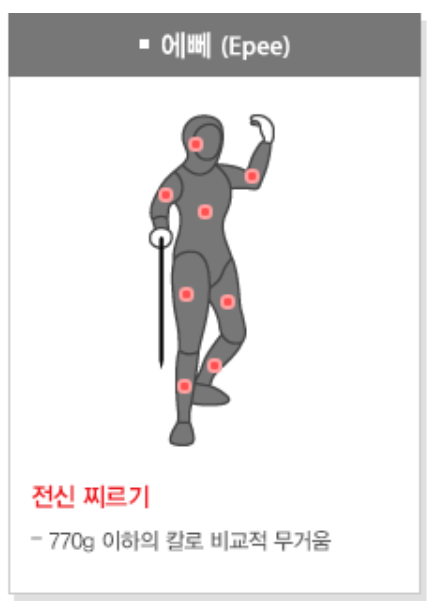에페 종목은 온몸의 전신을 찌를 수 있습니다. 검은 날길이 90cm이고 무게는 770g 이하의 검을 사용합니다. 오직 검 끝을 사용하여 몸 전체를 찔러야 득점으로 인정됩니다.